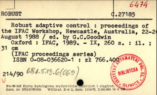 Robust adaptive control : proceedings of the IFAC Workshop, Newcastle, Australia, 22-2-August 1988