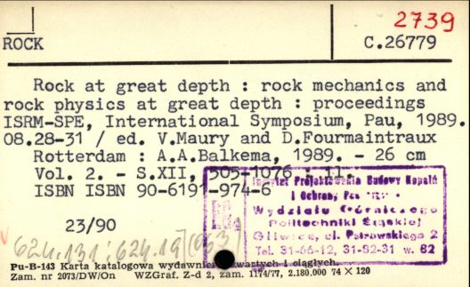 Rock at great depth : rock mechanics and rock physics at great depth : proceedings ISRM-SPE, International Symposium, Pau, 1989. 08.28-31